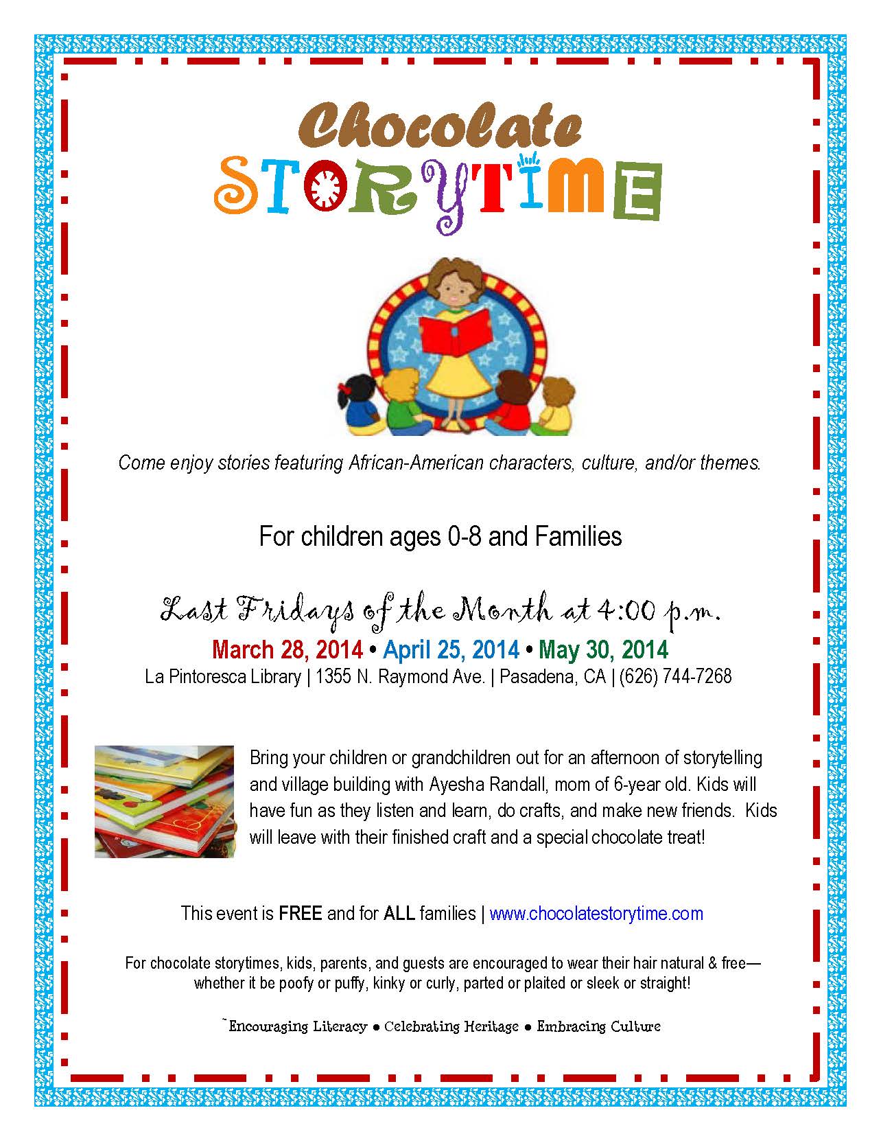 Three more dates have been added to LaPintoresca Library’s Chocolate Storytime! They will be on the last Friday of each month: March 28, 2014, April 25, 2014, and May 30, 2014 at 4:00 p.m. There will be special guests from the community and exciting arts and crafts activities.
