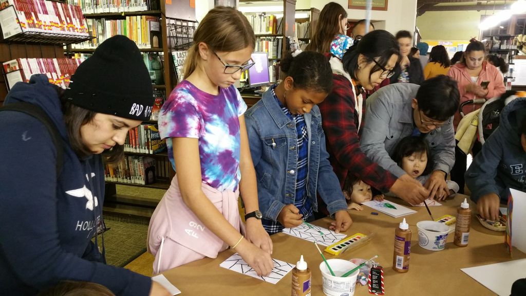 Following Chocolate Storytime, families enjoyed tamales and champurrado, a beloved part of the La Pintoresca Tree Lighting tradition. Alicia, my 6th grader was right alongside me, helping with Chocolate Storytime and later participating in the arts and crafts activity that followed the reading. Her friend, Emma came along, too.